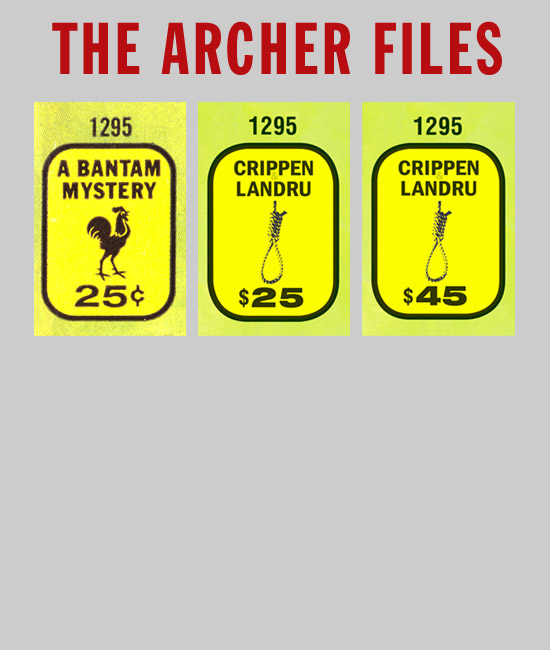 The instances where the Trade Gothic and Franklin Gothic fonts appeared worked out well. Adjustments in tracking, scaling, and kerning were possible so that a good match to the feel and look of the original cover type could be made. Unfortunately, I didn't have a version of Helvetica Neue with the correct lineweight available to me for the 25¢ price. I had ones that were too light or a little too bold to tweak. If I was going to sacrifice a bit of authenticity, opting for a little too bold seemed preferable. The pricing on the softcover of The Archer Files parallels the original better visually than the limited edition hardcover. Doug Greene was gracious enough to allow me to create custom versions of the Crippen & Landru logo so that I could have the entire package come across as looking like a Bantam paperback. I'm grateful to Doug and Tom for indulging my idea to carry the project to the logical extreme by giving me complete freedom to ape the front and back covers, spine, and title page of The Name is Archer.